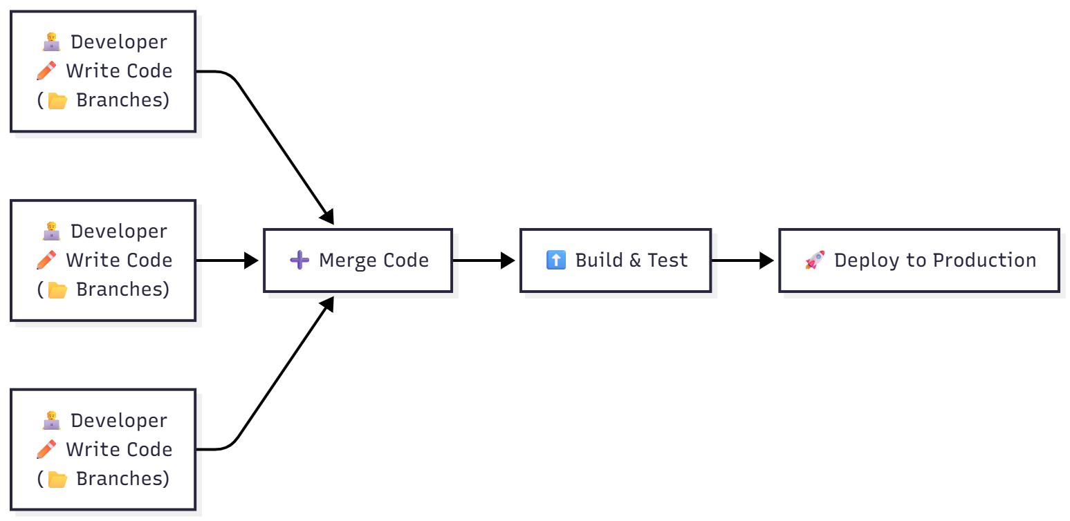 개발자의 애플리케이션 변경 사항이 CI 단계에서 자동화된 빌드 및 테스트를 통과한 검증된 코드가 레포지토리(예: GitHub, 컨테이너 레지스트리)로 자동 업로드되어 “언제든 배포 가능한 상태”가 되도록 만드는 자동화 방식이다.